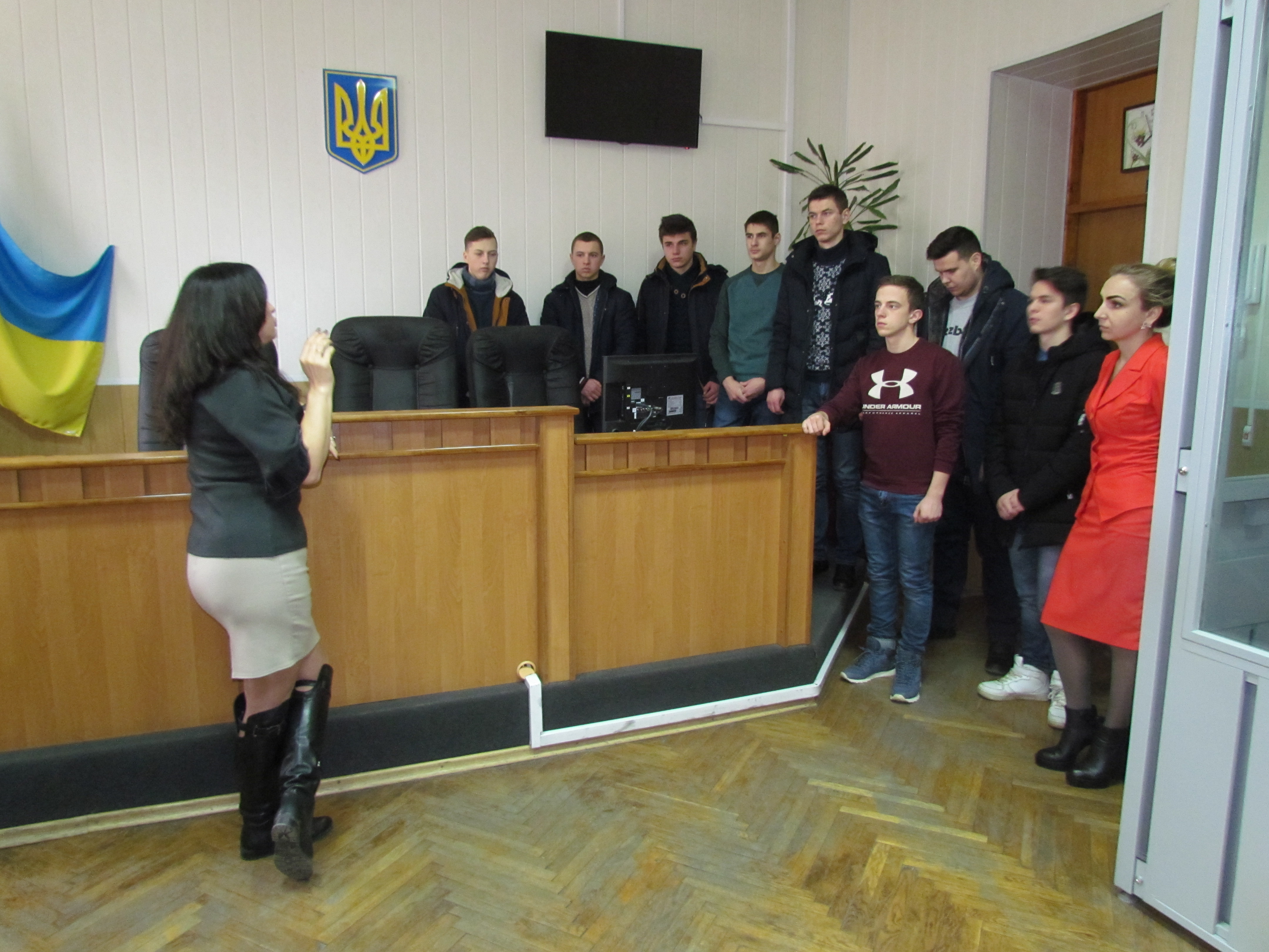 Зустрічали майбутніх правників заступник керівника апарату Руслана Федорова та прес-секретарі суду. «Ми раді Вас вітати в одному із найбільших судів України. Саме в нашому суді першої інстанції розпочинається судовий процес із захисту прав та законних інтересів громадян» – розпочала розмову Руслана Вікторівна. Далі в одному із залів суду, Світлана Біліченко розповіла студентам про історію будівлі суду та ознайомила присутніх із етичними та процесуальними нормами поведінки у приміщені суду. В свою чергу Каріна Тарасова проінформувала присутніх про засади роботи судді, його помічника та секретаря, про процедуру формування та впорядкування справ. Студентам продемонстрували клітку нового зразка – скляне загородження, яке відокремлює підсудних від складу суду й присутніх громадян.