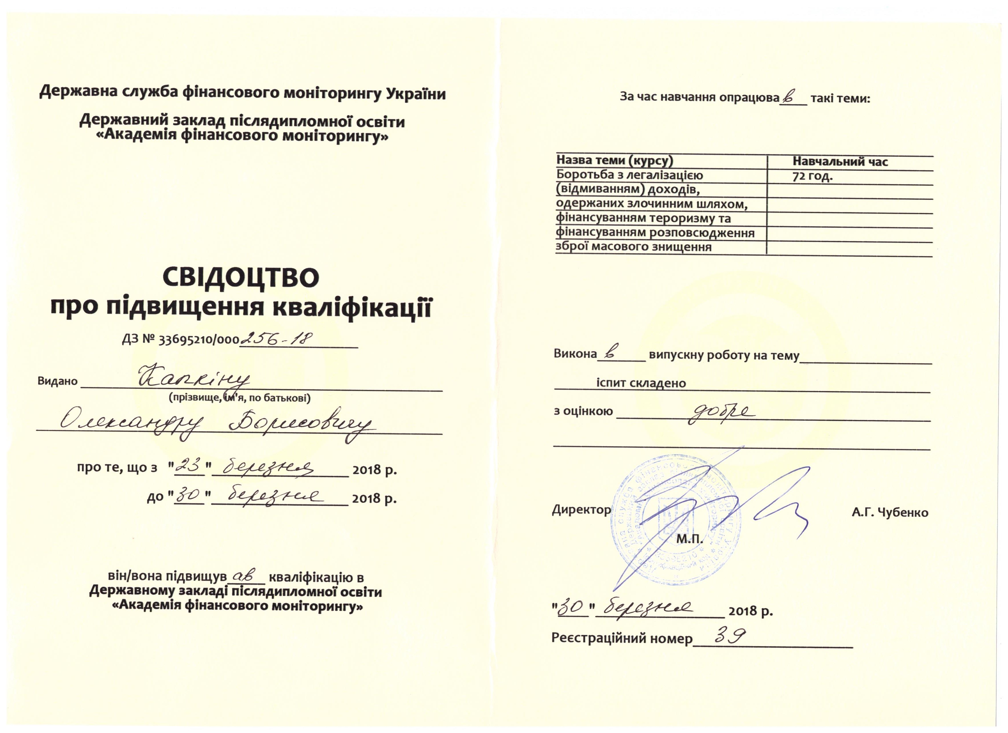 Суддя Зарічного районного суду м. Суми Олександр Капкін та помічник судді Лілія Герасименко з 23 по 30 березня 2018 року підвищували кваліфікацію в Державному закладі післядипломної освіти «Академія фінансового моніторингу» в м. Харків.